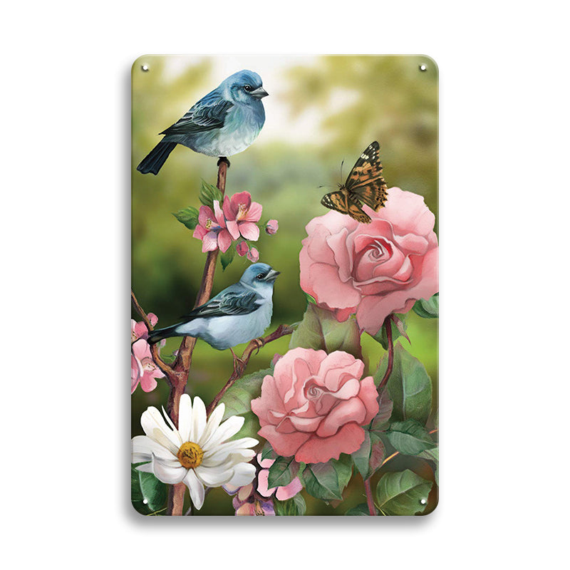 青い小鳥と蝶々、ピンクのバラや白い花が描かれた美しいブリキ看板です。