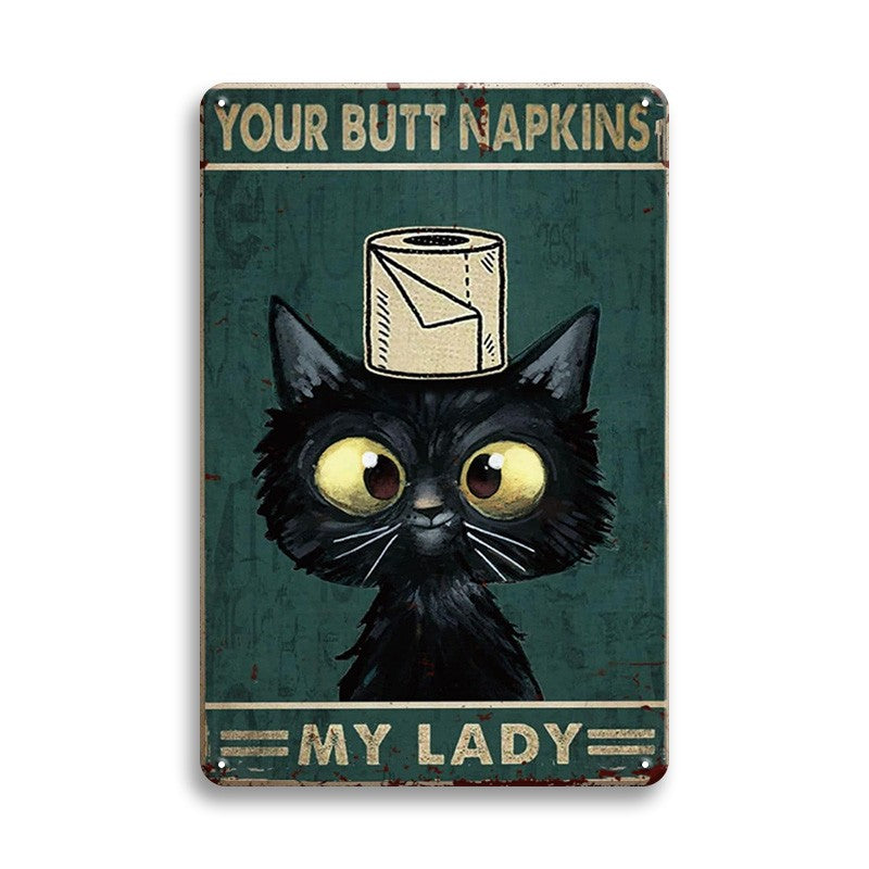 ユーモラスな黒猫がトイレットペーパーを頭に乗せた可愛いブリキ看板です。