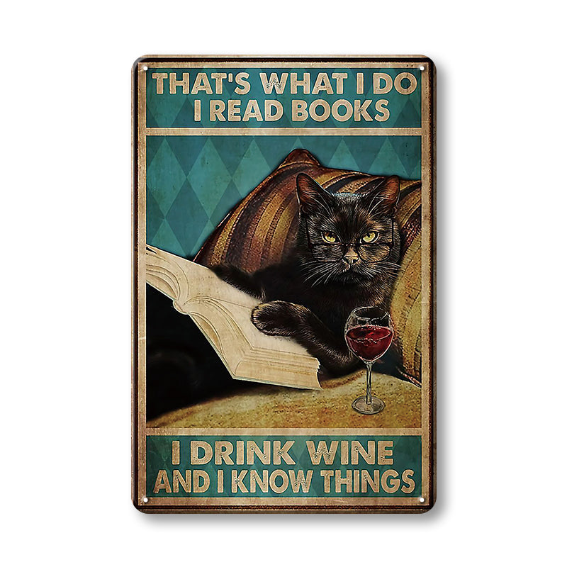 本を読みながらワインを楽しむ黒猫が描かれたユニークなブリキ看板。