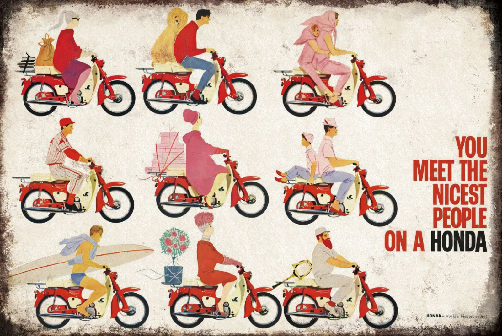 「You meet the nicest people on a Honda」の名コピーで有名な、ホンダのビンテージ広告風デザインのブリキ看板です。 カラフルでユニークなイラストは、お部屋やガレージの雰囲気を一気におしゃれに演出します。 バイクファンやレトロ雑貨好きな方へのプレゼントにも最適です。 看の裏面は上下左右すべての辺が裏側に折り曲げて加工されています。 サイズは横30cm、縦20cmです。