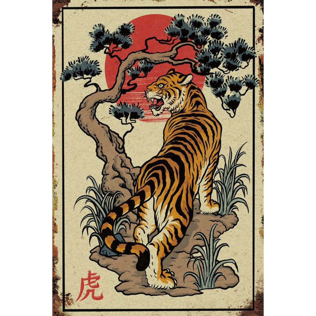 勇ましい虎が松の木と赤い太陽を背景に描かれた、和風テイストのブリキ看板です。