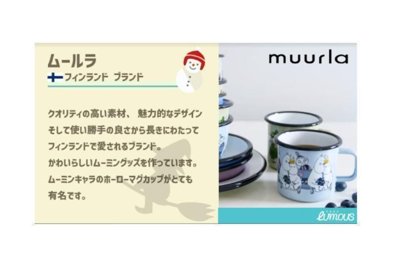 フィンランドのメーカームールラのマグカップです。 ホーロー製で、錆びにくく、腐食に強いので長く使っていただけます。保温性にも優れてます。 サイズ: 高さ8cm×幅9.5cm 容量:約 3,7dL (370mL) 素材:ホーロー(銅板・エナメルコーティング) 製造国:フィンランド 電子レンジ不可。食洗機可。 人気の素材「ホーロー」 つるんとした光沢が美しく、どこか懐かしい雰囲気。 ホーローとはアルミや鉄などの金属の表面にガラス質の釉薬を高温で焼きつけ、強度と熱伝導率を高めた素材です。 金属の熱伝導のよさとガラスの光沢の美しさを兼ねそろえており、見た目だけではなく機能性も抜群。 ホーロー製は傷付きにくいことから、雑菌の繁殖を防ぐことができて衛生的。また耐熱性にも優れており、直火にかけることができます。 匂い移りしにくいのも特徴。また、ガラスや陶器比べて軽量なので、キャンプやピクニックなどのアウトドアにいかがですか? 汚れがこびりつきにくく、色の劣化も少ないので長く使うことができます。