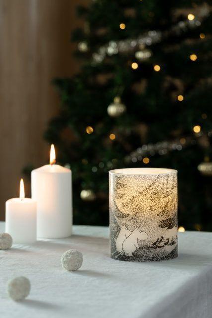 このLEDキャンドルは、ムーミンと仲間たちが「もみの木の下」で過ごす静かな冬のひとときを描いた、温かみのあるデザインです。