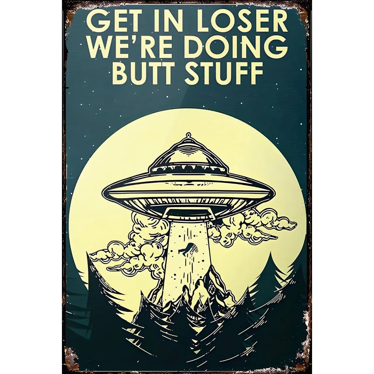 ユニークなUFOとジョークメッセージが描かれたブリキ看板です。