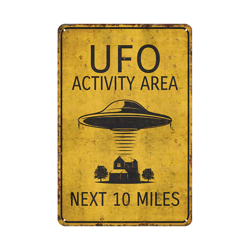 「UFO Activity Area NEXT 10 MILES」と書かれた、レトロな雰囲気のブリキ看板です。