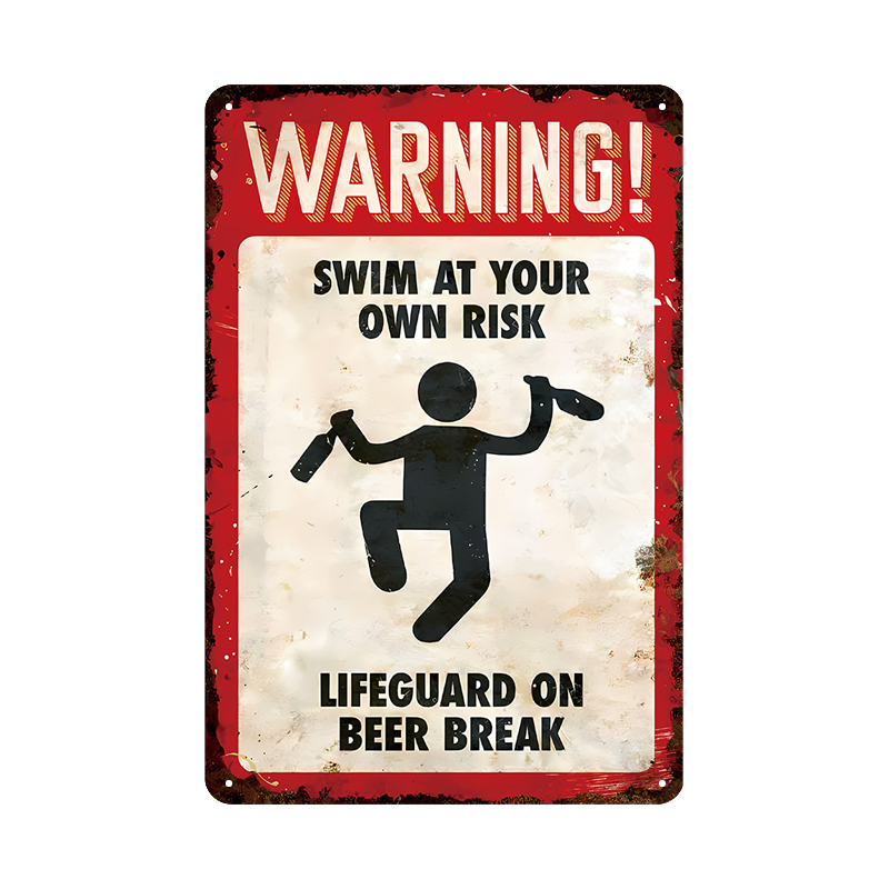 「WARNING! SWIM AT YOUR OWN RISK LIFEGUARD ON BEER BREAK」デザインのユーモラスなブリキ看板です。